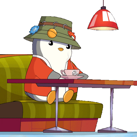 A sad and upset pudgy penguin, wearing a fishing hat and red jacket, sits alone at a cafe table with a teacup, appearing to be waiting.
