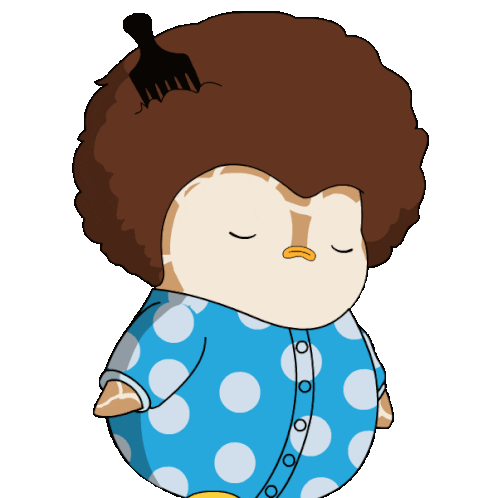 A cartoon owl with an afro and pick, wearing blue polka-dot pajamas, sighs with closed eyes, expressing tiredness or resignation.