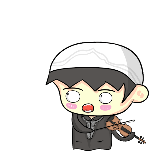 Animated sticker of a cartoon boy in traditional attire playing violin and calling 'Sahur' for the pre-dawn meal.