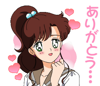 Sailor Jupiter, Makoto Kino, expresses gratitude with a shy smile and floating hearts, saying 'Thank you'.