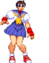 Sakura Kasugano from Street Fighter performs a lively dance in this pixel art animated sticker, showcasing her iconic win pose.