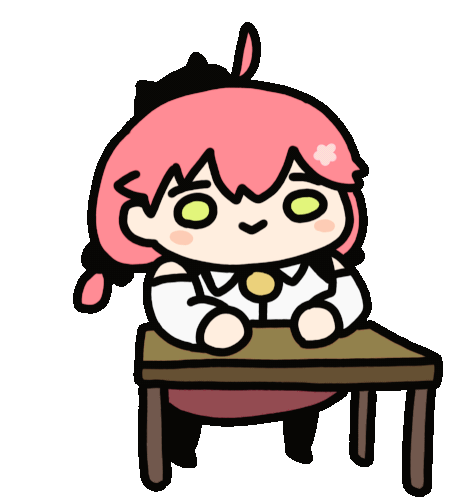 Sakura Miko from Hololive, a pink-haired chibi character, sitting at a table with hands raised in excitement.