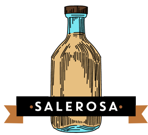 A stylized drawing of a Salerosa Mezcal bottle with a black banner featuring the brand name.