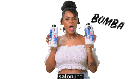 Lais Oliveira enthusiastically presents two Salon Line Bomba hair products, showcasing her beautiful curly hair and a confident expression.