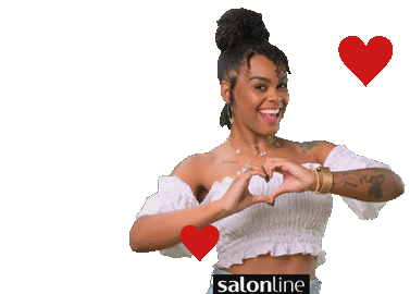 Lais Oliveira, representing Salon Line, forms a heart with her hands, smiling with her beautiful curly hair, surrounded by floating hearts.