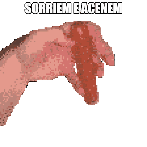 Salsicha, a pixelated hand, makes a beckoning gesture with the caption 'Sorriem e Acenem' (Smile and Wave).
