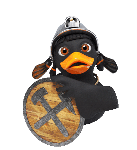 An animated sticker of Sally the duck, a miner character from Salz Hallein, wearing a helmet and holding a shield with pickaxes.