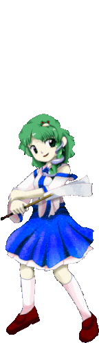 Sanae Kochiya from Touhou Project, wearing her iconic blue skirt and holding a wand, in an animated sticker.