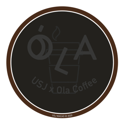 Sanolga presents the USJ x Ola Coffee neon logo from Macao, featuring glowing pink, blue, and orange letters.