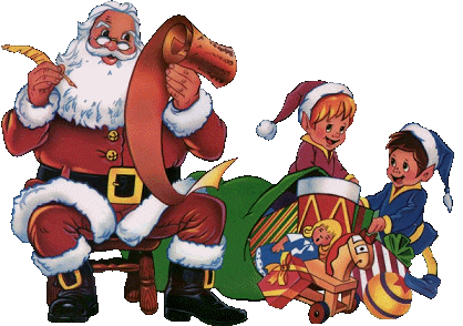 Santa Claus diligently writes his Christmas list while two cheerful elves play with festive toys and gifts.