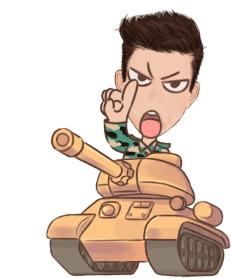 Santosh Dawar, a cartoon man in a military tank, points forward and transitions from shouting to a neutral expression.