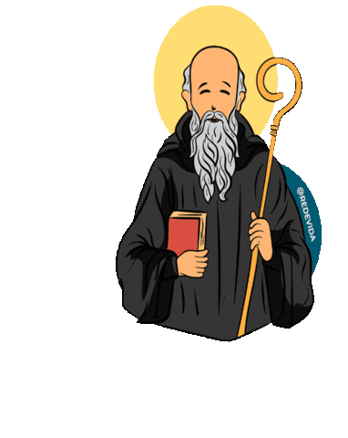 Animated sticker of São Bento, holding a red book and a staff, with a halo, from Rede Vida.