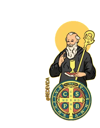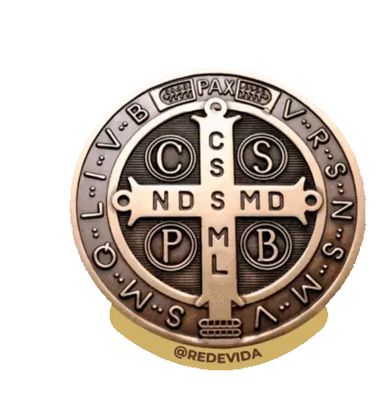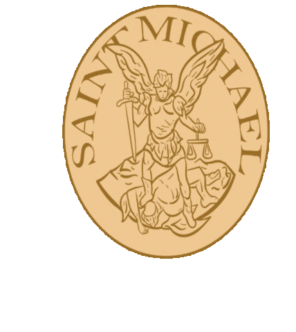 Um emblema dourado de São Miguel Arcanjo, segurando espada e balança, pisando sobre um demônio, em estilo de moeda.