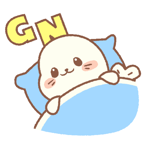 Adorable Sappy Seal character in bed, eyes closing to sleep, with 'GN' for good night.