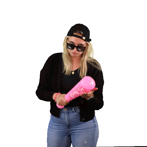 Saskiaknopf Huco, wearing a cap and pixelated sunglasses, playfully swings a vibrant pink bat.