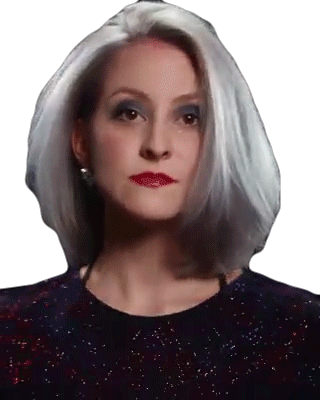 A sassy model with short, silver hair and bold makeup performs a confident hair flip, showcasing her new look.