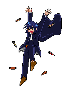Satoru Tsukada, a blue-haired character in a dark school uniform and cape, energetically jumps amidst floating carrots.