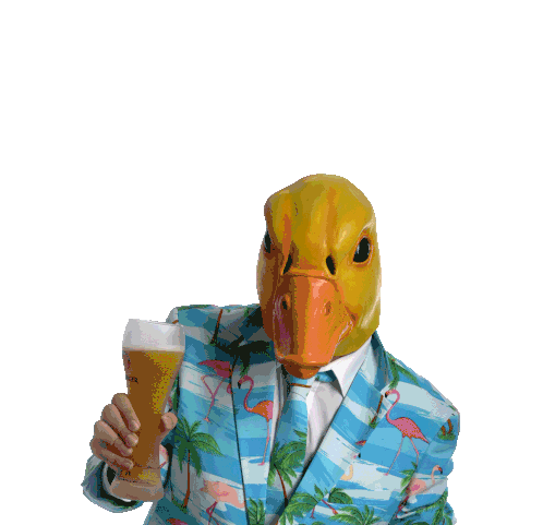 Ingo Ohne Flamingo in a flamingo suit holds a beer, with 'SAUFEN' appearing above, perfect for party vibes.