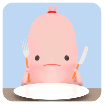 A large, pink, anthropomorphic sausage character holding cutlery, standing behind a plate of fast food and donuts.