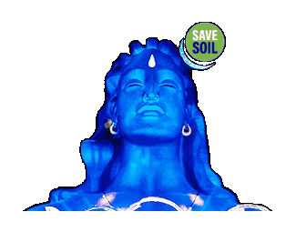 The iconic blue Adiyogi statue with a 'SAVE SOIL' badge, promoting environmental awareness and the Save Soil movement.