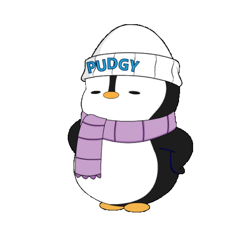 A cute cartoon Pudgy Penguin wearing a white beanie with 'PUDGY' text and a stylish purple scarf, posing with a sassy look.