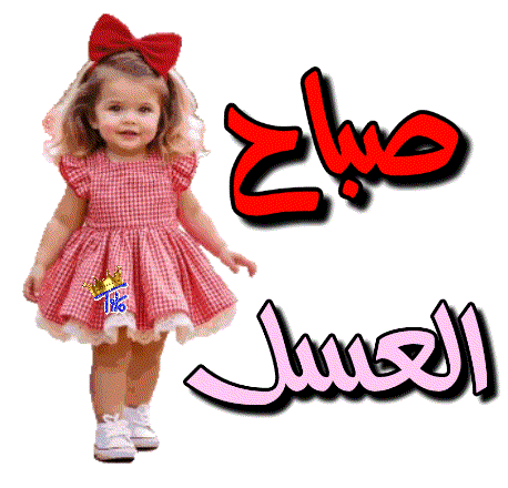 A cute little girl in a red checkered dress smiles and waves, accompanied by the Arabic greeting 'Good morning, honey'.