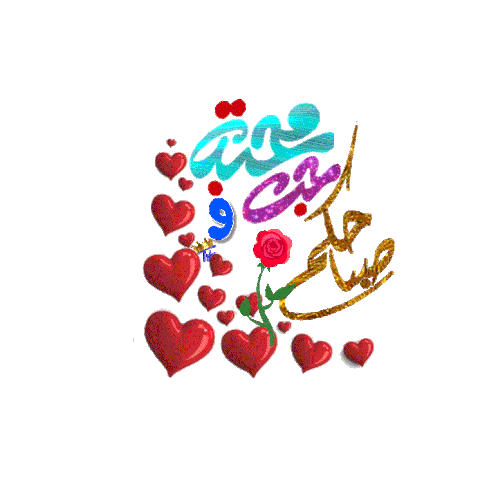 Vibrant animated sticker with red hearts, a rose, and sparkling Arabic calligraphy wishing a morning full of love and affection.