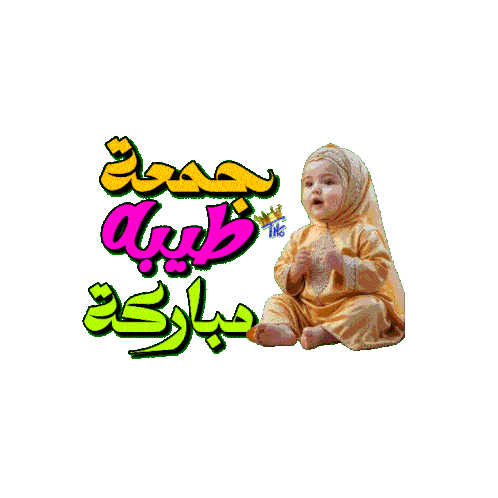 A cute baby in a hijab wishes a blessed Friday with the Arabic text "جمعة طيبة مباركة" (Blessed and good Friday).