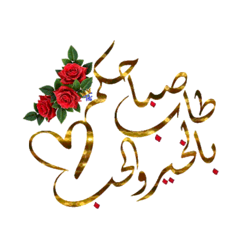 Animated sticker with golden Arabic calligraphy for 'Good Morning', featuring red roses and a heart shape.
