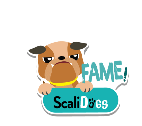 A grumpy ScaliDogs bulldog character holding a banner with 'ScaliDogs' and exclaiming 'FAME!' in this animated sticker.