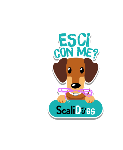 A cute Scalidogs dachshund holds a leash, asking 'Esci con me?' (Come out with me?) for a walk.
