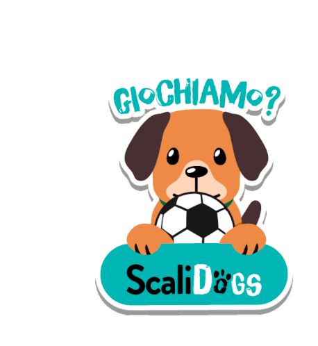 A cute cartoon dog from ScaliDogs winks and smiles while holding a soccer ball, inviting to play.