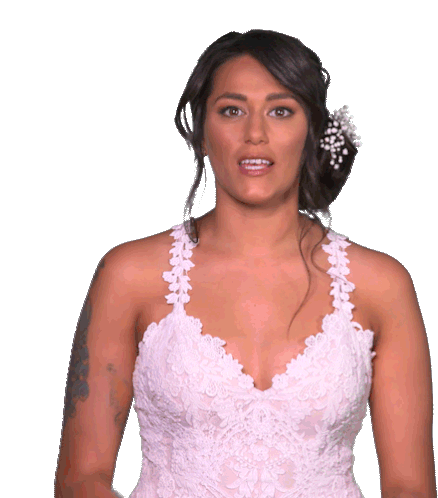 Connie, from Married At First Sight, appears scared and anxious, biting her nails while wearing a beautiful white wedding dress.