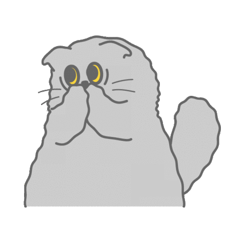 A cute cartoon cat with wide, yellow eyes covers its mouth with its paws, looking utterly shocked and scared.