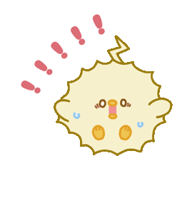A fluffy, light-colored creature with wide eyes, an open mouth, and sweat drops, surrounded by exclamation marks, showing fear.