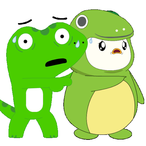 a cartoon of a lizard and a penguin with sweat coming out of their faces