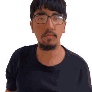 a man wearing glasses and a black shirt is looking at the camera