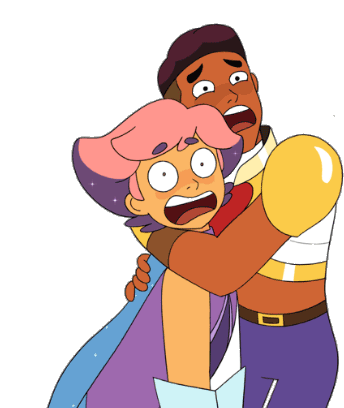 Glimmer and Bow from She-Ra and the Princesses of Power are wide-eyed and terrified, clinging to each other in fear.
