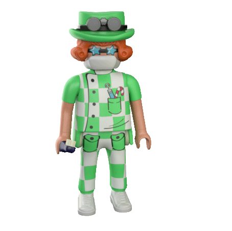 A Playmobil figure dressed as a scary dentist, wearing a green checkered outfit, goggles, and holding a brush, removes its hat.