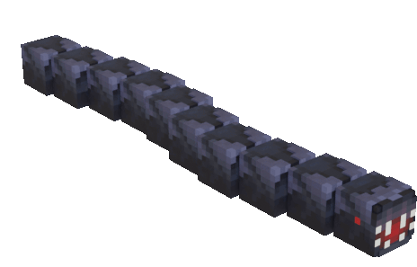 A pixelated Scatha worm from Hypixel Skyblock's Crystal Hollows, featuring a segmented body and glowing red eyes.