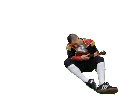 Julian Schmitt, dressed in a distinctive costume, plays a ukulele and looks up, creating an engaging animated sticker.