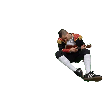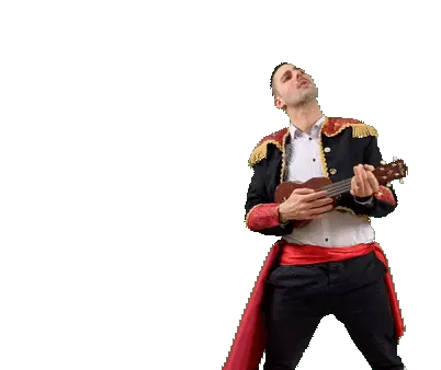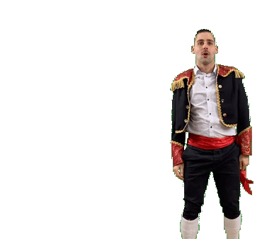 Julian Schmitt as Hüppo, a man in a matador-like costume, performs energetic and funny dance moves on a white background.