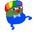 A pixel art Pepe the Frog character, dressed as a clown with a rainbow wig and red nose, performs the Schubert Walk.