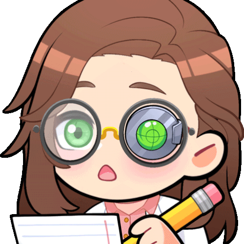 A cartoon girl, a mad scientist, with a cyborg eye and glasses, diligently taking notes with a pencil.