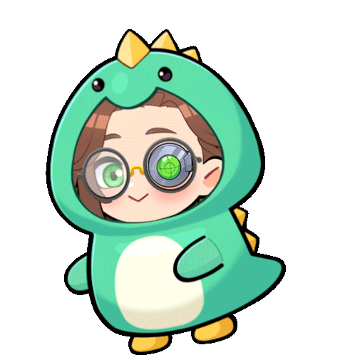 a cartoon character with glasses and a green eye is wearing a dinosaur costume