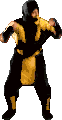 a pixel art of a man in a black and yellow ninja costume dancing .