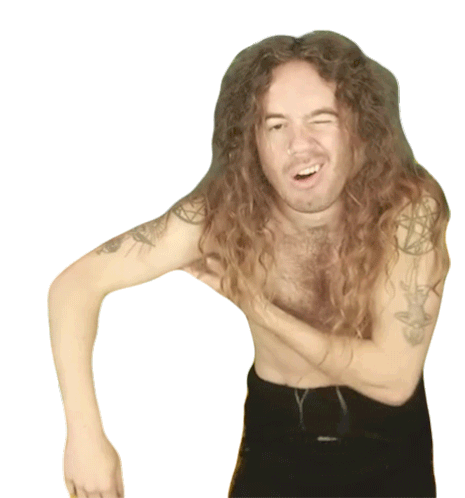 Bradley Hall, shirtless with long hair, scratches his armpit with a winking, playful expression.