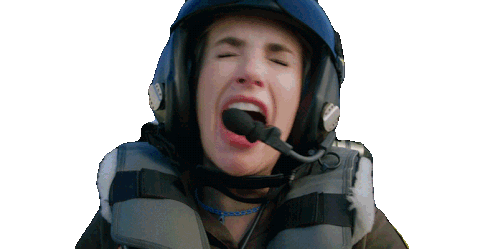 Rex, wearing a pilot's helmet and flight vest, screams intensely with wide-open mouth.