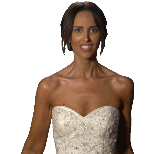 Lizzie from Married At First Sight screaming intensely with hands raised, wearing a white wedding dress, expressing shock or excitement.