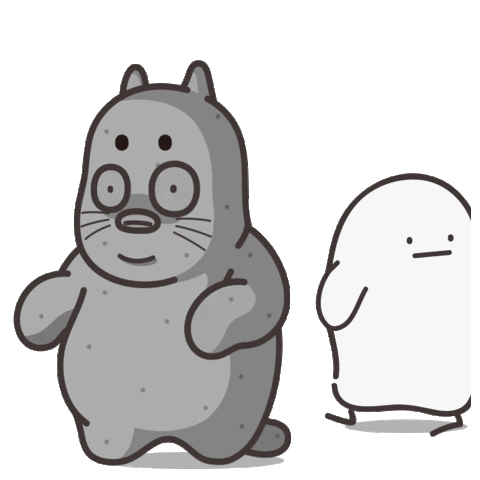 A grey cat-like character is startled by a white, ghost-like figure peeking out from behind it, showing a surprised reaction.